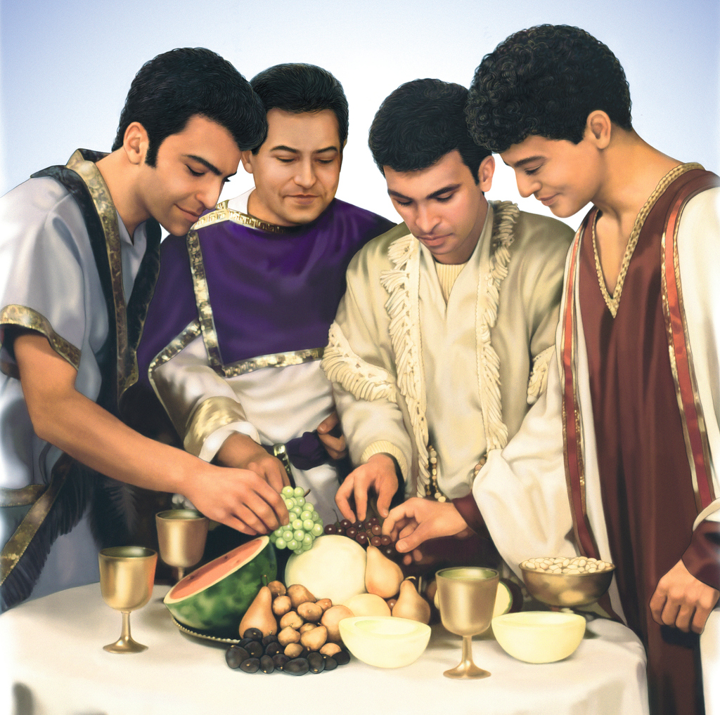 But Daniel purposed in his heart that he would not defile himself with the portion of the king’s meat, nor with the wine which he drank: therefore he requested of the prince of the eunuchs that he might not defile himself. Now God had brought Daniel into favour and tender love with the prince of the eunuchs. And the prince of the eunuchs said unto Daniel, I fear my lord the king, who hath appointed your meat and your drink: for why should he see your faces worse liking than the children which are of your sort? then shall ye make me endanger my head to the king. Then said Daniel to Melzar, whom the prince of the eunuchs had set over Daniel, Hananiah, Mishael, and Azariah, Prove thy servants, I beseech thee, ten days; and let them give us pulse to eat, and water to drink. Then let our countenances be looked upon before thee, and the countenance of the children that eat of the portion of the king’s meat: and as thou seest, deal with thy servants. So he consented to them in this matter, and proved them ten days. And at the end of ten days their countenances appeared fairer and fatter in flesh than all the children which did eat the portion of the king’s meat. Thus Melzar took away the portion of their meat, and the wine that they should drink; and gave them pulse. As for these four children, God gave them knowledge and skill in all learning and wisdom: and Daniel had understanding in all visions and dreams. Now at the end of the days that the king had said he should bring them in, then the prince of the eunuchs brought them in before Nebuchadnezzar. And the king communed with them; and among them all was found none like Daniel, Hananiah, Mishael, and Azariah: therefore stood they before the king. And in all matters of wisdom and understanding, that the king enquired of them, he found them ten times better than all the magicians and astrologers that were in all his realm. And Daniel continued even unto the first year of king Cyrus.
